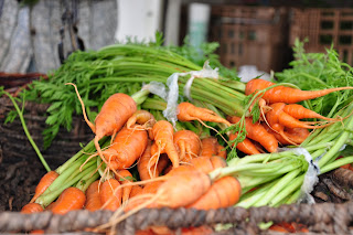 I took the bunch of carrots from the market and peeled them. (If making at home, and you don't have these carrots, you might want to use about 1 medium carrot per person). These little babies were like two carrots attached on the top, very strange and hard to peel but totally worth it! Later, cut in 1/2 inch chunks. Warm at medium heat a dash of butter and olive oil, add half of a diced small onion and carrots. Cook for about 35 minutes in medium-low, until browned and caramelized. Then add some thawed frozen peas from bag, a sprig of thyme, sprinkle fresh pepper and kosher salt. Voila! Easy fresh side for your next dinner.